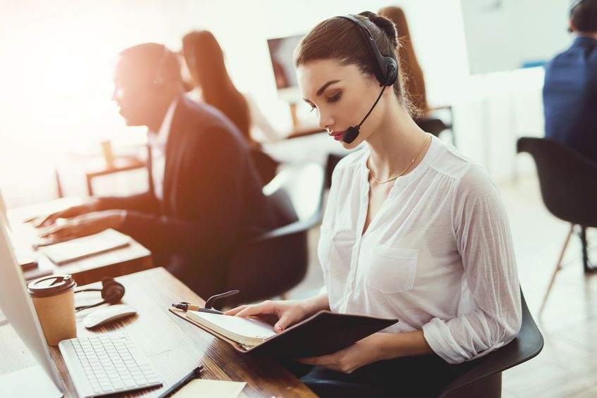 The girl is sitting at work in the call center.Have you ever had this experience? You have to phone your mobile phone company because you went over your data limit and want to upgrade your plan. After a brief discussion with a call center employee, you are interrupted by work and decide to pick it up another time.