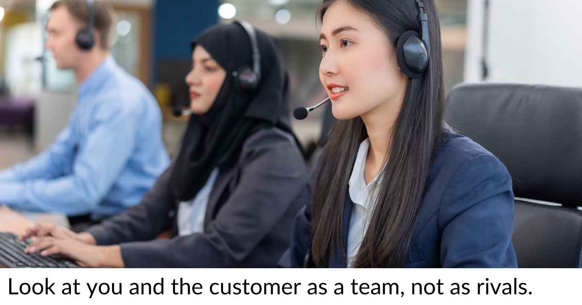 When working to resolve an issue with a customer, instead of taking a defensive stance, you should look at it as a partnership. You’re working together to find a solution.